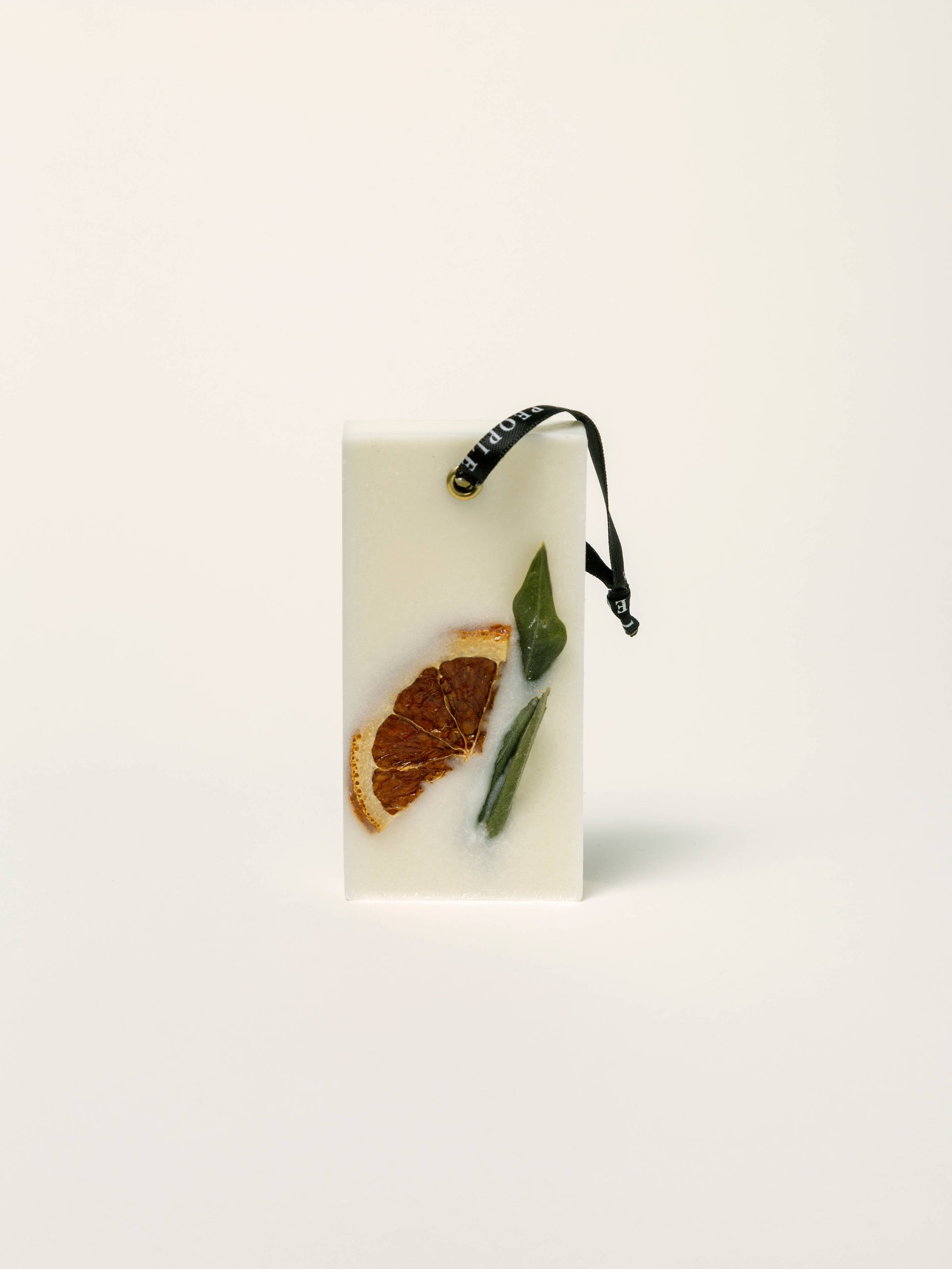 Solid soy wax or waxbar air freshener, handmade and adorned with botanical elements.