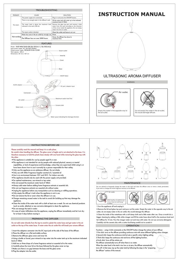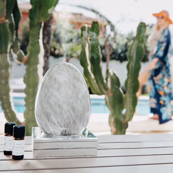 Our oval glass aroma diffuser creates pleasant indoor air by releasing a fine mist. By simply adding a few drops of one of our exclusive fragrance oils or essentials oils, you can create different ambiances by season, room or mood. The Marble Edition aroma diffuser works with a programmable LED lighting system. You can choose to have the lighting setting change automatically, leave it on a fixed setting or turn the light off. You can enjoy scented mist with the light setting both on and off. This lifestyle product is as functional as is beautiful.-Mist and fragrance per 100ml water: duration 6-10 hours.-Automatic shutdown when the water has evaporated.-Soft LED lighting-7 colour settings-Fragrant oils are sold separately. How does the Sthlm Fragrance Supplier Marble Edition Aroma Diffuser work? This beautifully crafted aroma diffuser uses ultrasonic vibrations to break down the fragrance oil that has been added to the water into micro molecules. By breaking down the scent through vibration, the scent is diffused as a fine cool mist. This technology ensures that the oil is mixed homogeneously into the water. This diffusion method uses no heat meaning that both essential and fragrances oils maintain their positive properties. The mist from the aroma diffuser serves as a humidifier and therefor has many health benefits that provide increased well-being. Where can I use my aroma diffuser? Sthlm Fragrance Supplier Aroma Diffusers are indoor products. Our products are designed to create atmosphere and ambience in any room of your choice, be it in your home, your office or even for commercial use in spa?s or hotels. There are no limits to which indoor space you can scent with our aroma diffusers. Simply choose the space you wish to fragrance and choose from our selection of fragrance or essential oils to create your indoor oasis. Benefits of using an Aroma Diffuser: Easy to change scent to change atmosphere. Spreads scent quickly though out a room thru cool mist Maintains oils quality and properties. Cost effective compared to candles. How do I operate my aroma diffuser? Here are seven easy steps to get you up and running! Please note, there is an instruction manual provided in the box. We recommend users to read this instruction manual before using this product. Step 1: Carefully remove the product from the packaging on a flat surface, removing all plastic and protective coverings. Caution: The marble edition comes with a glass egg cover. Step 2: Place the base of the diffuser on a flat surface near a power outlet. Step 3: Add water to the water tank using a jug or a bottle on the opposite side to the air outlet up as far as the marked fill line. Do not place the base under a tap. The base has an air outlet on the upper lip and water must not get into this air outlet. Water in this outlet will cause the diffuser to malfunction. Step 4: Choose your favourite fragrance from the Sthlm Fragrance Supplier line of essential or fragrance oils and add two to three drops to the water. Step 5: Place the inner lid on the base and carefully place the glass top over the base. The glass top will reach the bottom of the base and is only correctly positioned when sitting on the bottom lip of the base. Step 6: Connect the power cable to the base of the diffuser. Step 7: Press once to turn on the diffuser and enjoy fragrant mist and changing LED lighting. Press twice to enjoy fragrant mist with the LED lighting fixed on your colour of choice. Press a third time to turn of the LED lighting but enjoy fragrant mist. Press a fourth time to turn of the diffuser. Please note. All our diffusers come with a safety mechanism that means when the diffuser is out of water it will turn off automatically.