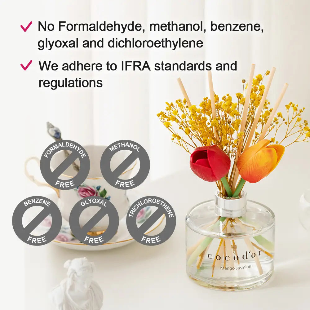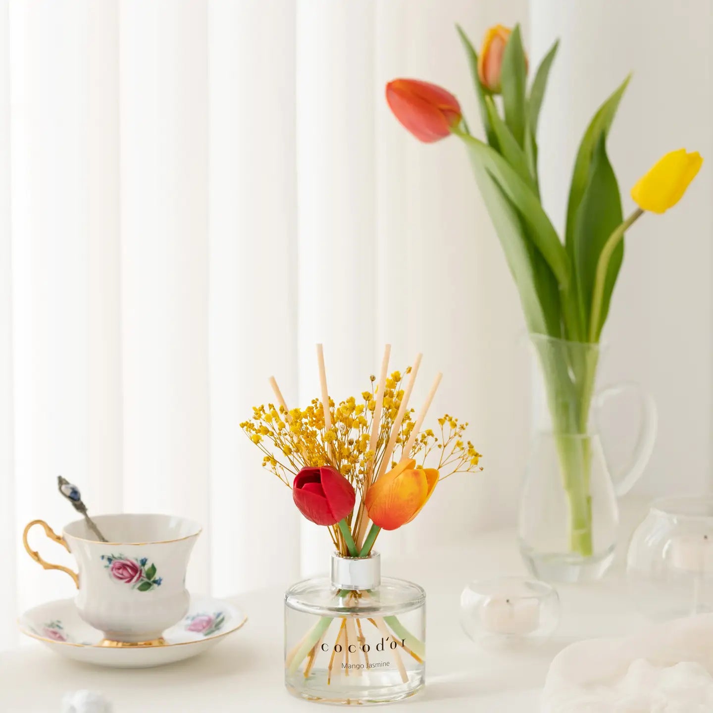 Infuse your home with the graceful scent and beauty of the Cocodor Tulip Diffuser. This 200ml reed diffuser features five black fiber sticks, two lifelike tulips in red and orange, and real preserved pink gypsophila flowers, making it a stunning decorative piece while delivering a continuous, captivating aroma. Lovely Peony – Soft & Feminine 💖 Romantic & Elegant – A lush blend of peony, magnolia, and pink musk, bringing a sensual yet delicate floral aroma. 🌿 Ideal for Any Space – Adds beauty and relaxation to the bedroom, living room, or spa. 🎀 A Unique & Thoughtful Gift – Perfect for Easter, birthdays, anniversaries, or summer celebrations. Perfect for home, office, or spa, this spring-ready diffuser combines luxury, nature, and long-lasting fragrance in one elegant design. 🌷✨