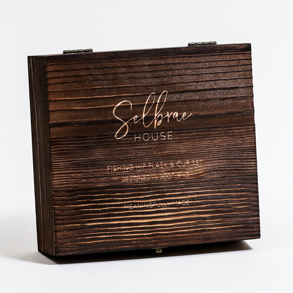 Embrace your love for fishing with our Hip Flask & Cup set, designed for outdoor enthusiasts who appreciate a good drink on the go. The set includes a sleek hip flask and set of two cups, all engraved with charming fishing-themed accents. Packaged in a wooden Selbrae House gift box, this set makes for a thoughtful and stylish gift for anglers who enjoy relaxing with a sip of their favourite tipple.
