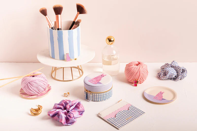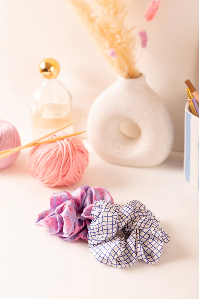 Playful cats and bold graphic lines make the Happy Cat Scrunchie Duo an instant mood booster. Featuring cheerful pink and navy tones, this duo adds a fun, modern twist to any hairstyle. Wear them together for a bold, quirky statement, or separately for a softer, everyday look. A colorful and whimsical pair that turns every day into a good hair day!