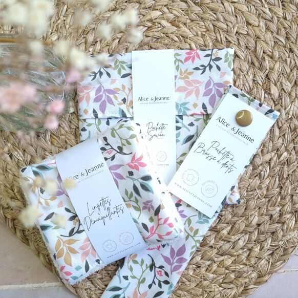 Juliette, a magnificent floral pattern in soft, pastel tones. Very easy to combine, it is a must-have available in each of our creations.ÿEasily transport your zero-waste soaps, shampoos and other solid care products thanks to our Alice et Jeanne coated cotton pouch. Hand-sewn in our Montpellier workshop, this nomadic waterproof pouch accompanies you everywhere.ÿThis coloring is also available in a toothbrush pouch. Dimensions: 11x11 cm Wash in cold water. No dryer.