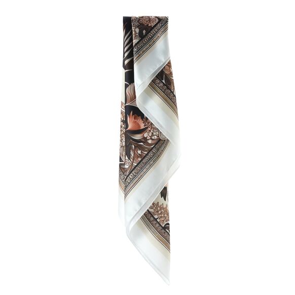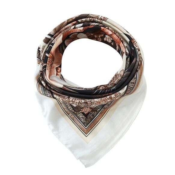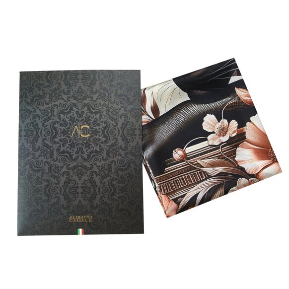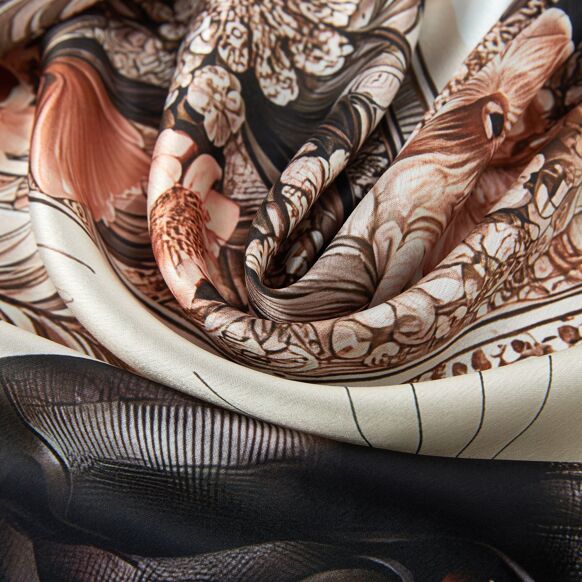 Dive into a world of mystery and elegance with the ?MystŠre Florale? scarf. This silk masterpiece features a sumptuous black panther, a symbol of strength and mystery, surrounded by delicate flowers and lush foliage. The contrast between the vigor of the feline and the softness of the pink flowers creates a captivating visual harmony, perfect for those who wish to express both their inner strength and their aesthetic sensitivity. Made from 100% silk, this scarf from the Alberto Cabale brand measures 90x90cm, offering not only comfort but also versatility in styling. Summary: Size: 90x90cm Material: 100% Silk Pattern: Panther and Floral Predominant Color: Black, Pink and Cream Gift Box: Each scarf is carefully presented in a luxurious gift box, ready to charm its recipient. A sublime gift to mark special occasions or simply to spoil a loved one.Size of the square fashion scarf