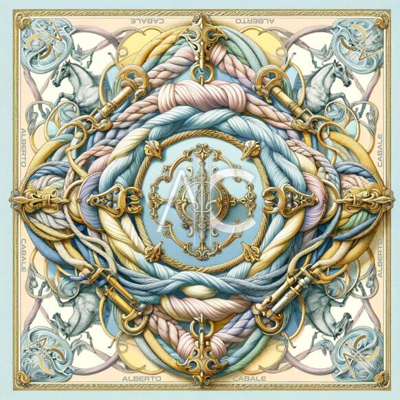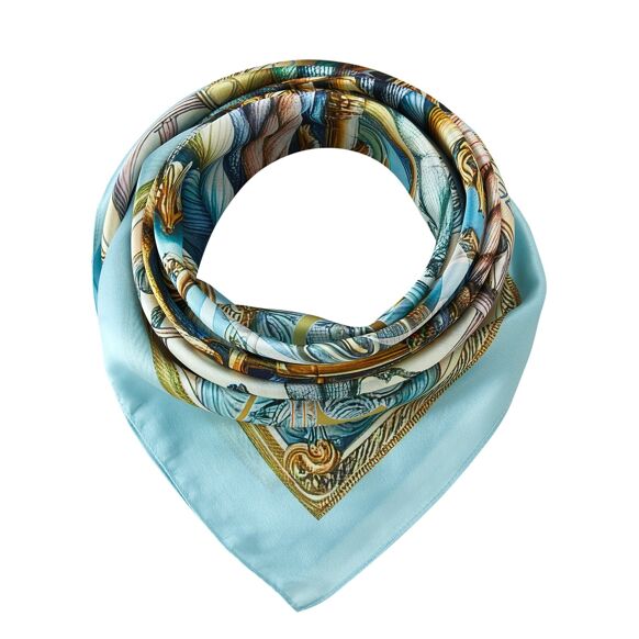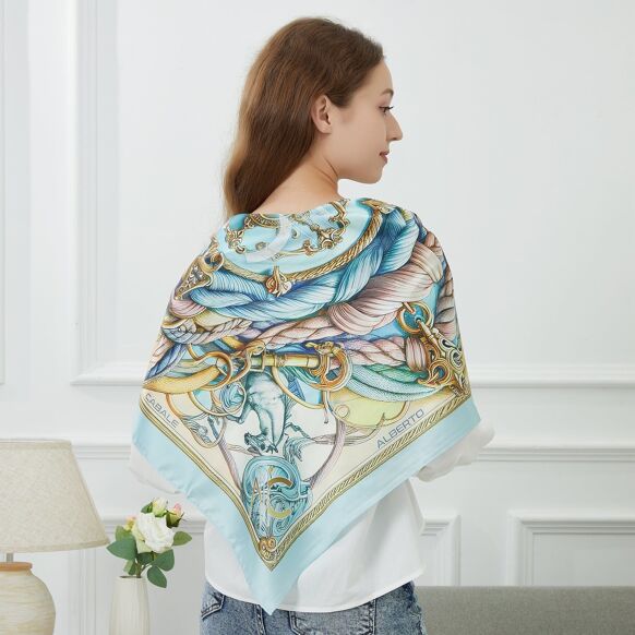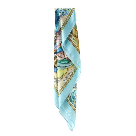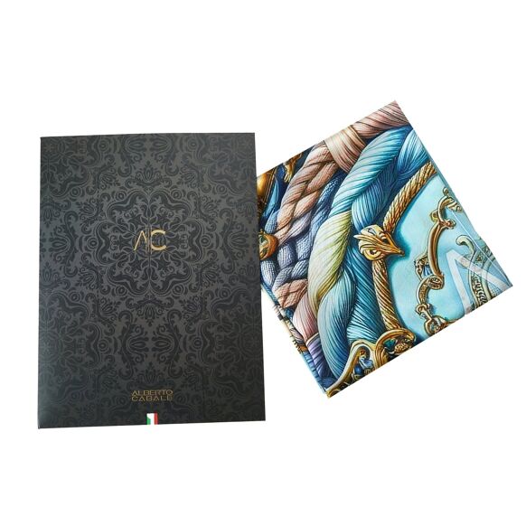 The "Spring Rope" scarf from the Zo‚ collection by Alberto Cabale embodies an exquisite fusion of baroque style and spring motifs. Made from 100% silk, this large 90x90cm square features a composition rich in ornamental details intertwined with floral and marine elements in soft pastel tones. The patterns of golden ropes and delicate flowers create a captivating and elegant visual effect, making this scarf a must-have to enhance an outfit with sophistication. Summary: Size: 90x90 cm Material: 100% silk Pattern: Ornamental patterns, ropes, and marine elements intertwined with flowers Predominant Color: Pastel blue, gold, and touches of pink Gift Box: Presented in our luxurious gift box, the "Spring Rope" scarf is ready to be given as a gift, perfect for those who cherish refined accessories and elaborate artistic designs.Size of the square fashion scarf
