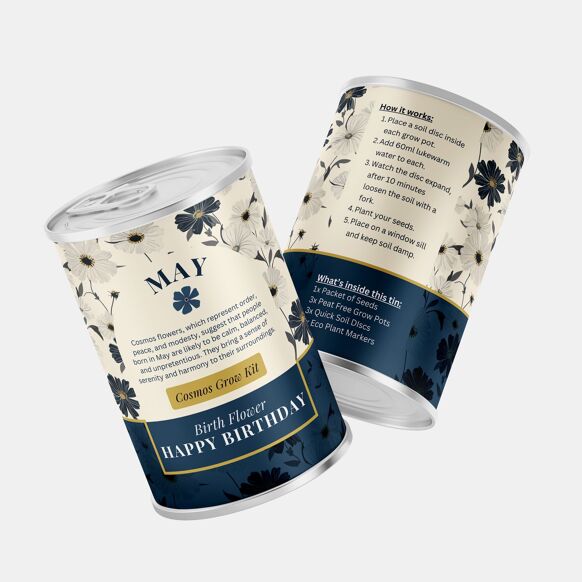 Celebrate a birthday in the most thoughtful way with our Grow Your Own Birth Flower Tin. The perfect gift for her, for garden enthusiasts or those who love a thoughtful, unique birthday gift. Our eco-friendly, retro-style tin is customised with your choice of text (see images) and includes everything needed to grow stunning flowers: 1 x Birth Month Flower Tin; 1 x Packet of Flower Seeds; 3 x Peat-Free Grow Pots; 3 x Soil Discs; 3 x Eco Plant Markers