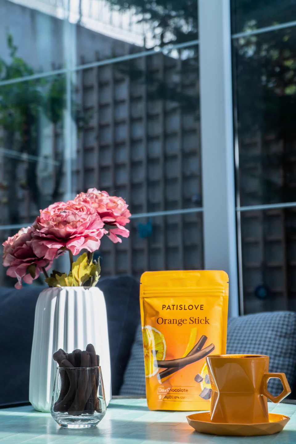 Patislove Orange Stick combines the vibrant zest of orange peel with the smooth richness of dark Swiss chocolate. Each bite offers a harmonious contrast of citrusy brightness and 57% cocoa depth, creating a taste that’s both bold and balanced. Made without preservatives or added colourants, it’s a naturally honest treat with no artificial extras. Whether you're unwinding with coffee, entertaining guests, or simply indulging in a moment for yourself, this elegant stick format makes it easy to savour and share. Sealed in a resealable pouch, it's a convenient luxury for home or on the go. A refined classic reimagined—pure, flavorful, and unforgettable.