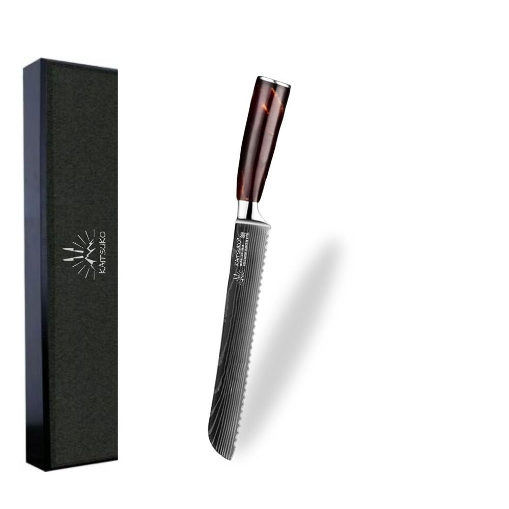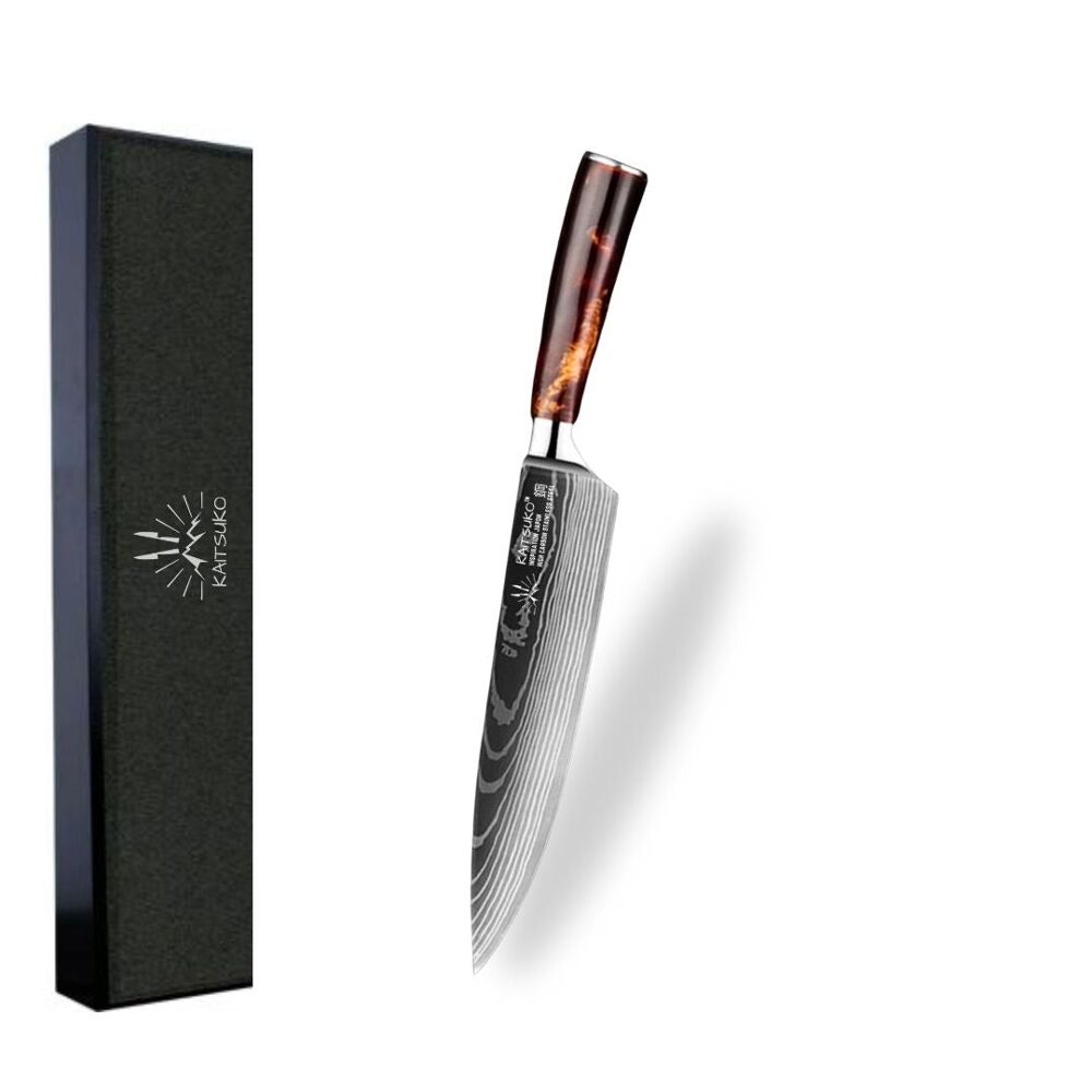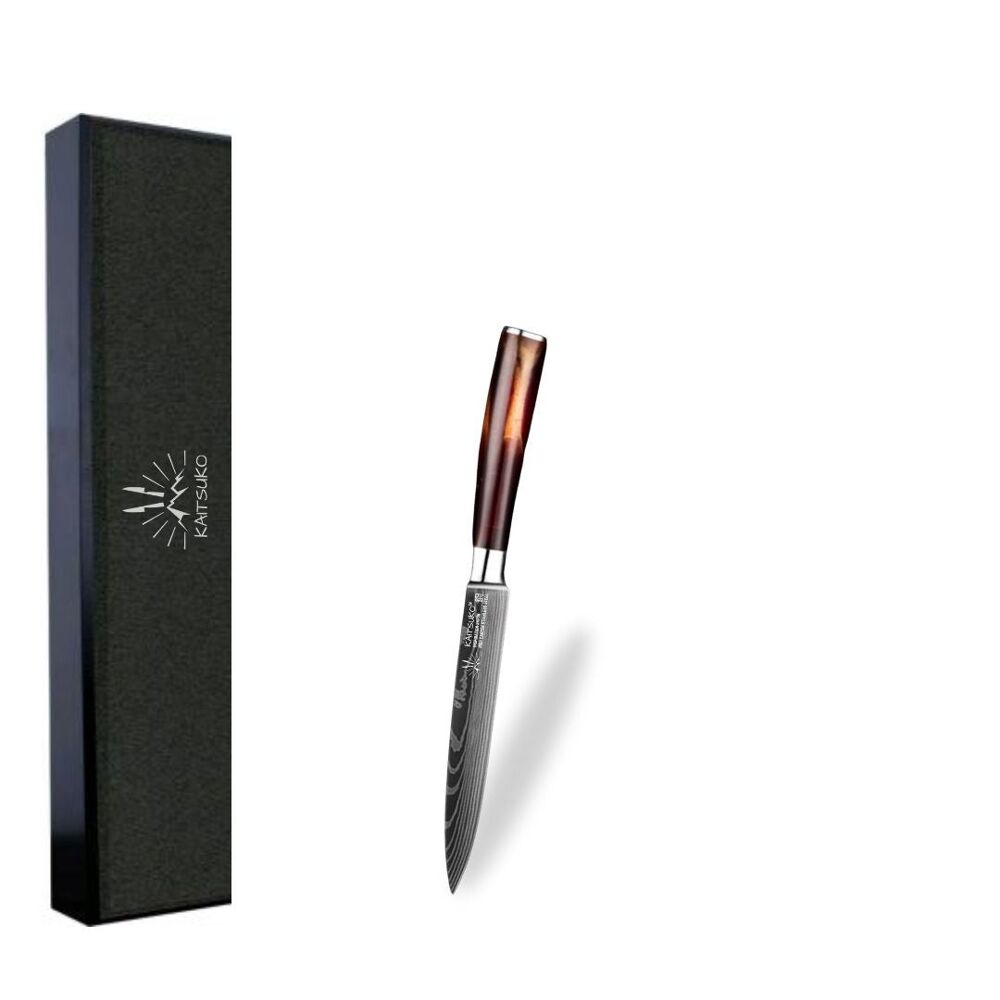 Chef Tanaka Collection Discover our Chef Tanaka collection. These very lightweight chef's knives are a quality type of knife, made of stainless steel. They will allow you to progress quickly in the preparation of your dishes. From chef's knives to paring knives, they will bring a touch of elegance and originality to your kitchen. These exceptionally sharp knives will allow you to cut any food cleanly and precisely much more easily. The knives in the Chef Tanaka collection are available in different colors. We offer you another complete knife set, the Set of 10 Japanese-style knives - Chef Tanaka - Ocean Blue. The specificities of each knife Chef knife - 200g: Made for cutting meat and fish, cutting herbs, peeling vegetables, cutting fruit Bread knife - 173g: Made for cutting all types of bread, hard or thick crust Santoku knife - 191g: Made for cutting pieces of meat, chopping different spices, fruits and vegetables Nakiri knife - 217g: Made for slicing herbs and vegetables without damaging them Boning knife - 150g: Made for scraping the flesh from the bone, cutting small bones Utility knife - 100g: Made for making very precise cuts Paring knife - 86g: Made for cutting sausage slices, slicing herbs, hollowing out fruits and vegetables Blade material: 7CR17 steel Handle material: Epoxy resin Steel hardness: 58ñ2 HRC Laser engraving is a sublimation technique that we We use it on Tanaka knives only.