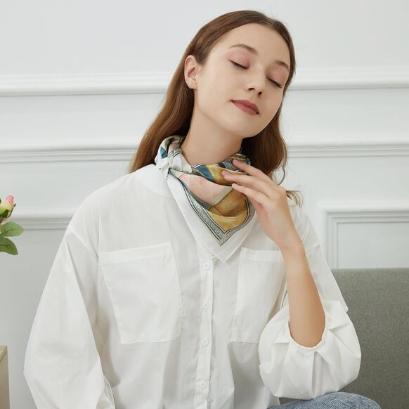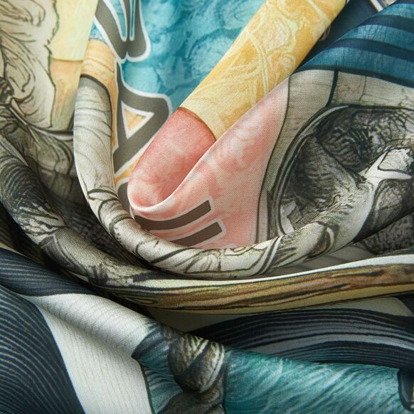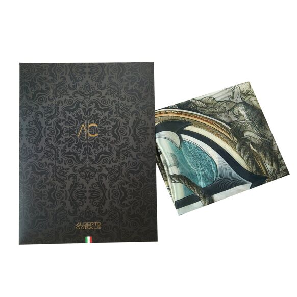 The "Anchoring of Dreams" scarf by Alberto Cabale captures the essence of adventure and discovery. At the heart of this design, a majestic anchor intertwined with sturdy ropes stands out against a background depicting an elegant ship sailing through turbulent waters. Framed with delicate floral motifs and classic nautical patterns in subtle hues of blue, cream and gold, this scarf embodies the spirit of legendary sea voyages. Crafted from pure silk, this 60x60cm square combines an artistic aesthetic with a luxurious finish, perfect for those who cherish a style that is both rich in history and elegance. Specific features: Material: 100% silk Size: 60x60cm Texture and patterns: Design composed of a central anchor, a ship, and various maritime and floral elements. The borders are decorated with various geometric patterns and textures imitating natural materials. Predominant Colour: Pale Blue, with gold and cream accents Summary: Size: 60x60cm Material: 100% Silk Pattern: Nautical and floral Predominant Colour: Pale Blue Gift Box: Comes in a luxurious printed box, ready to give, perfect for a special gift.